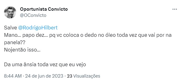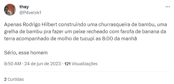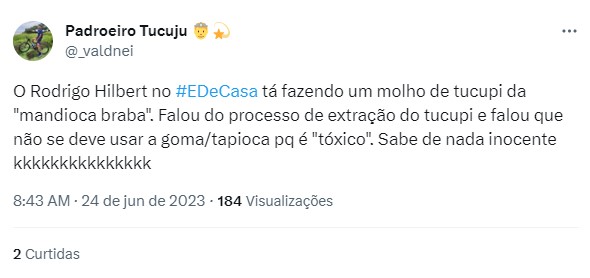 Na rede social, o público não perdoou. Um internauta afirmou que a ação de Rodrigo Hilbert foi extremamente nojenta e implorou para que a cena não seja repetida. Mais um foi por outro caminho e percebeu uma fala errônea do global sobre o molho de tucupi.