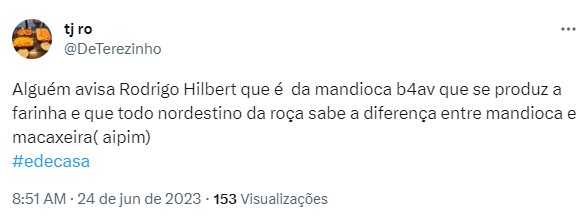 O famoso revelou que no processo de extração do tucupi não se deve usar a goma porque é tóxica. Um terceiro chamou o loiro de inocente pela fala. Outro explicou que da mandioca brava que se produz a farinha e todo o nordestino sabe a diferença entre mandioca e macaxeira.