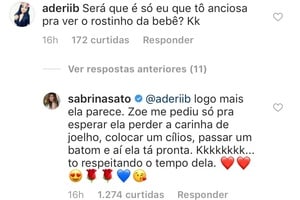 Sato acalmou os fãs. “Logo mais ela aparece”, afirmou. “Zoe me pediu só para esperar ela perder a carinha de joelho, colocar cílios, passar um batom, aí ela tá pronta. Tô respeitando o tempo dela“, brincou a japonesa.