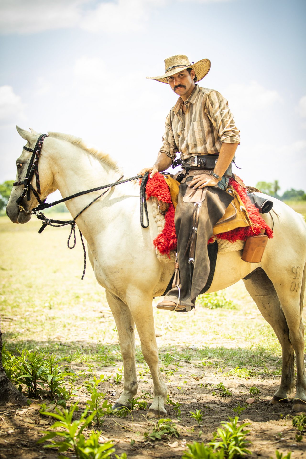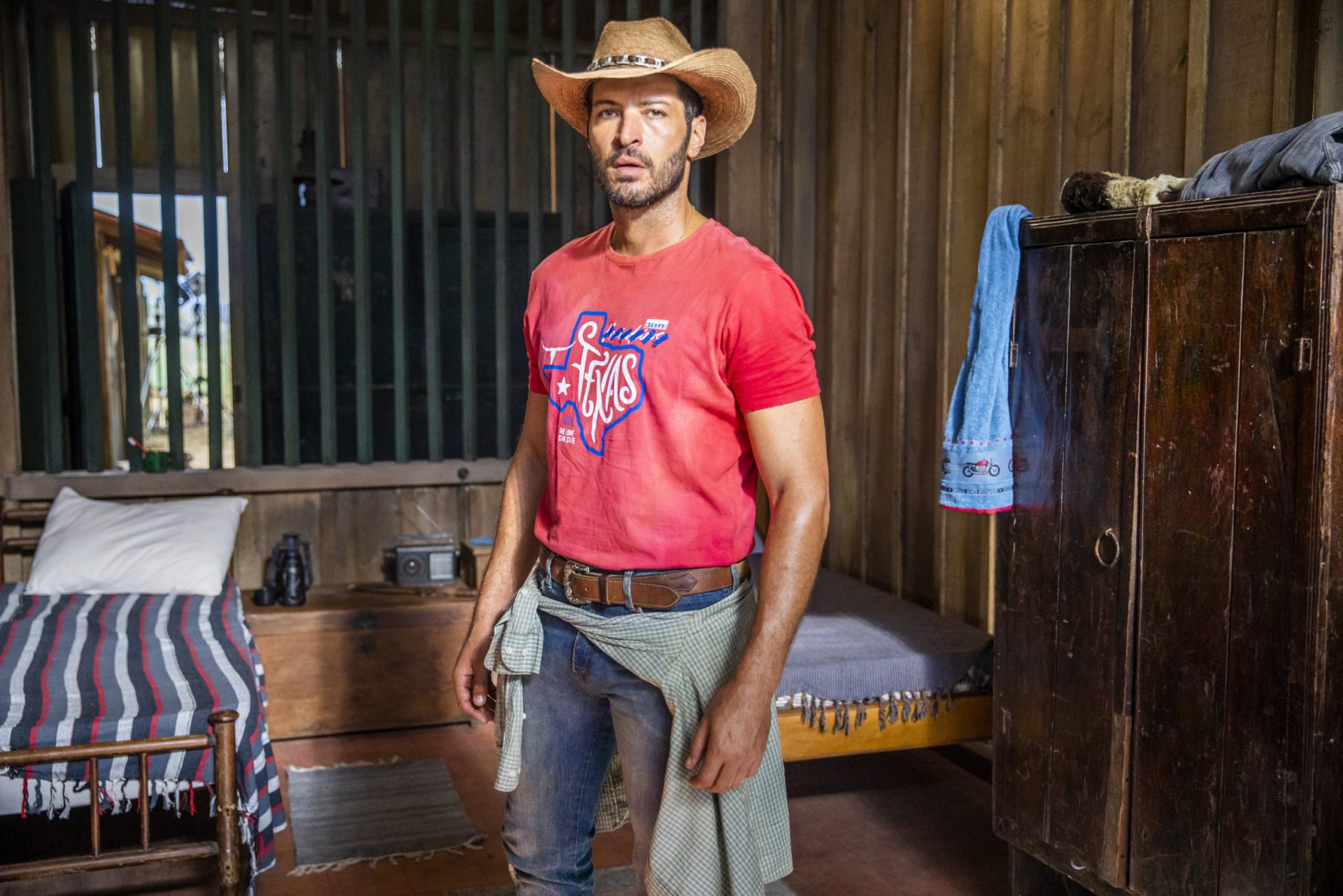 - Juliano Cazarré interpreta Alcides no remake de Pantanal; ator se afasta das gravações (Imagem: Divulgação / Globo)