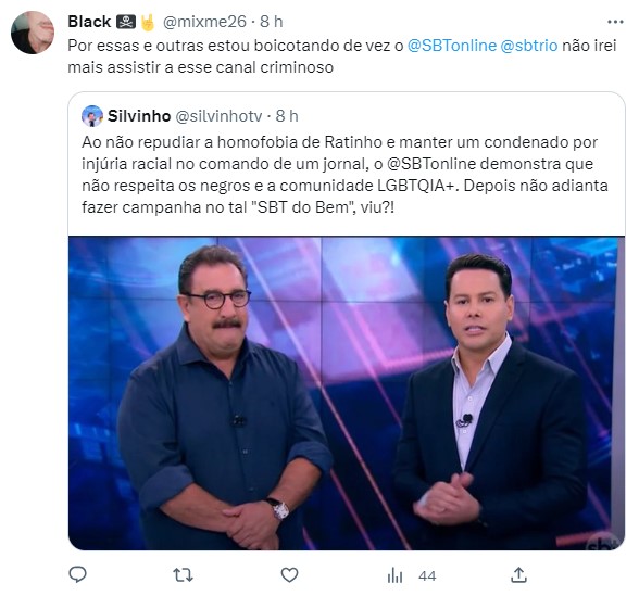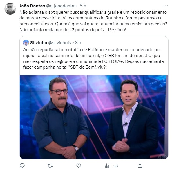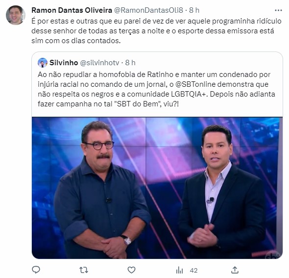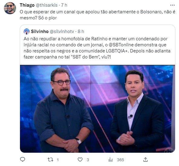 Um internauta usou a rede social e alertou que ao não detonar a homofobia e manter um condenado por injúria racial, o SBT não demonstra respeito a negros e a comunidade LGBTQIA+. Outro lembrou que a emissora apoiou Bolsonaro nos últimos 4 anos e exigiu uma postura correta de Daniela Beyruti.