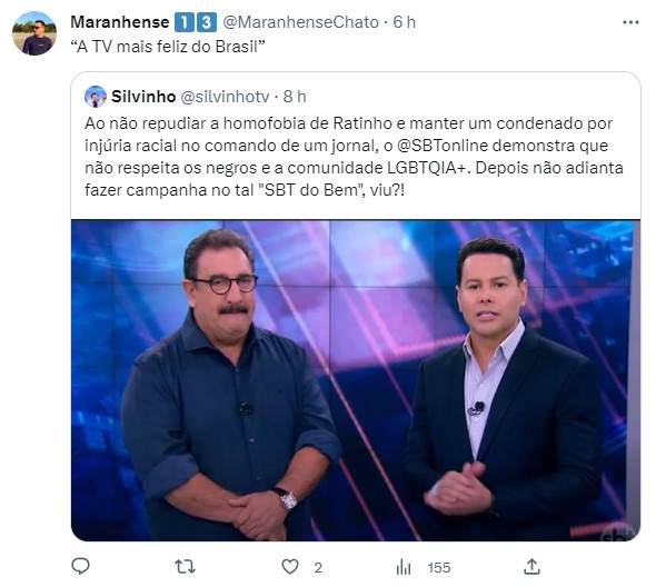 Um terceiro declarou que não adianta a cada buscar qualidade na programação e reposicionamento de marca com comentários preconceituosos de Ratinho. Mais um debochou do slogan TV mais feliz do Brasil.