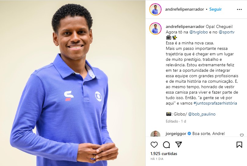 André estava na TNT Sports antes do acordo com a Globo. Sua saída da emissora da Warner foi revelada na semana passada. O apresentador foi escalado para CRB X Sampaio Corrêa, pela Série B, no SporTV 2.
