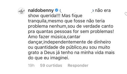 “Não era um show. Mas fique tranquila. Mesmo que fosse, não teria problema nenhum. Sou de verdade, canto para quantas pessoas forem, sem problema. Amo fazer música, cantar, dançar. Independentemente de dinheiro ou quantidade de público, eu sou muito grato a Deus. Já tenho na minha vida mais do que eu imaginei“, respondeu Naldo para uma fã.