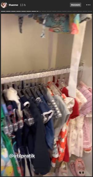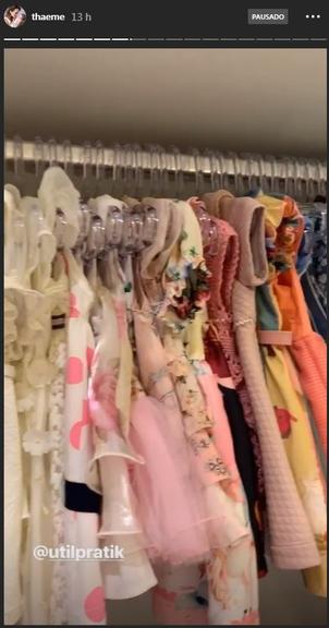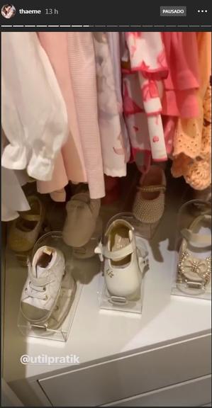 Nos vídeos, a cantora mostrou o cômodo que é recheado de vestidinhos e sapatinhos fofos. “A gente colocou tudo em cabides de acrílico para caber tudo certinho. Fora que fica um charme“, explicou a mamãe.