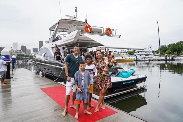 A mulher, inclusive, compartilhou uma foto da família na frente do barco em sua rede social comemorando o presente do esportista. Na legenda, ela falou sobre eles terem realizado um sonho.