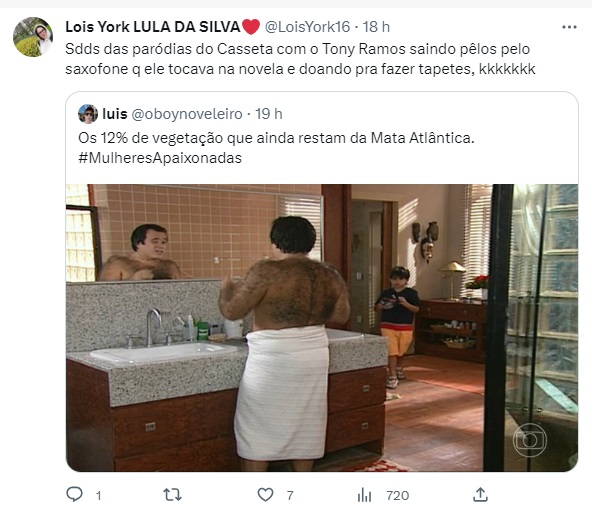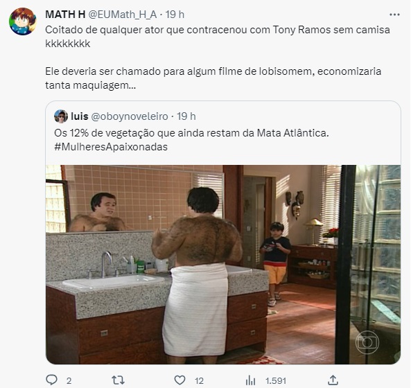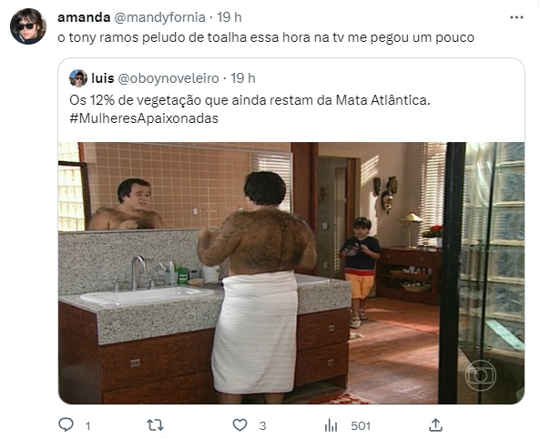 Quem acompanhou o capítulo de Mulheres Apaixonadas de terça-feira (14) foi surpreendido por uma cena de Tony Ramos. Em 2003, a exibição original mostrou o ator de toalha e exibiu de forma nua e crua os vários pelos no corpo do galã.