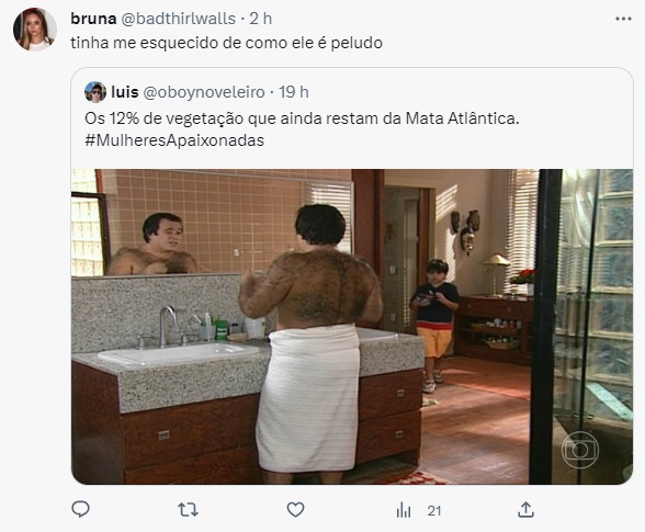 A imagem causou entre os internautas. Um brincou e disse que os 12% de vegetação restante da Mata Atlântica foram parar no corpo do contratado da Globo. Outro lembrou que o extinto humorístico Casseta & Planeta tinha a mania de provocar o ator por causa do seu corpo.