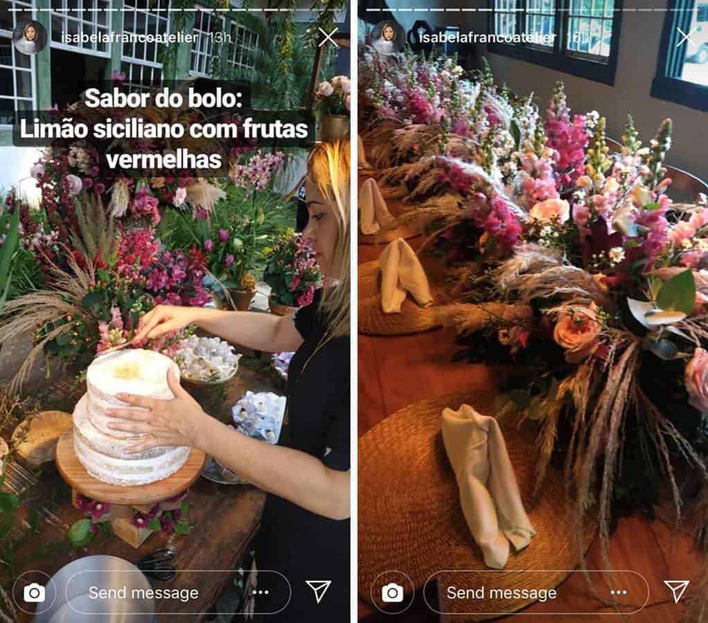 Nas fotos publicadas no Stories, é possível ver que a decoração do evento contou com muitas flores e plantas em tons escuros. Além de doces diversos, a mesa também foi composta por um bolo estilo naked no sabor limão siciliano e frutas vermelhas. E claro, não poderia faltar o famoso bem casado, que era no sabor creme de moça e ninho.