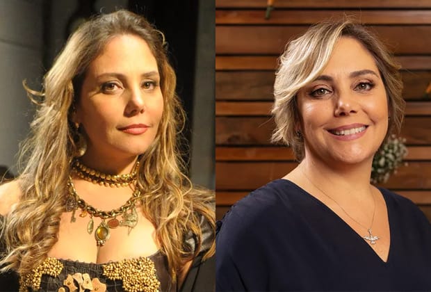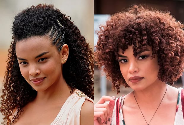 - Alinne Moraes com o cabelo liso para “Cordel” e, atualmente, com eles encaracolados para “Espelho da Vida”. (Imagem: Divulgação/ TV Globo)