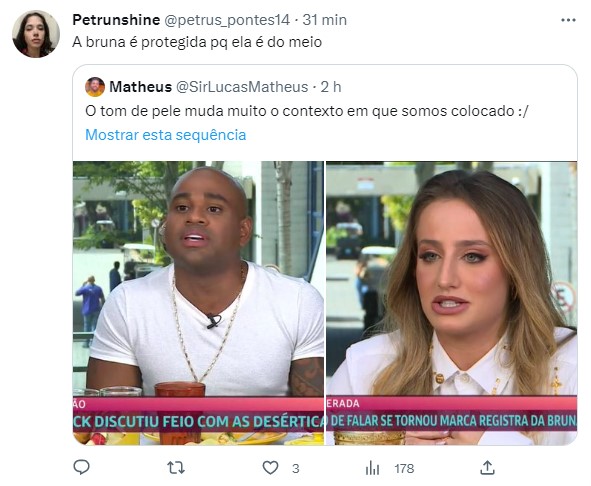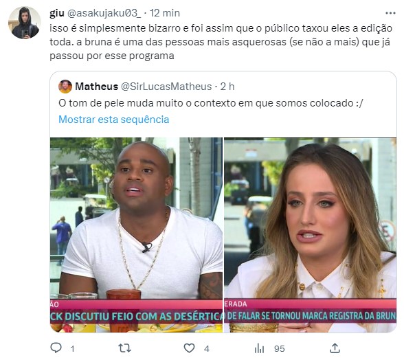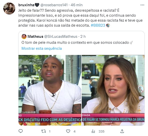 Enquanto o programa deixou Black acuado em seu café da manhã, Bruna foi colocada como a mocinha. Internautas ficaram revoltados com o posicionamento da Globo, em mais um exemplo de racismo estrutural envolvendo o BBB 2023.