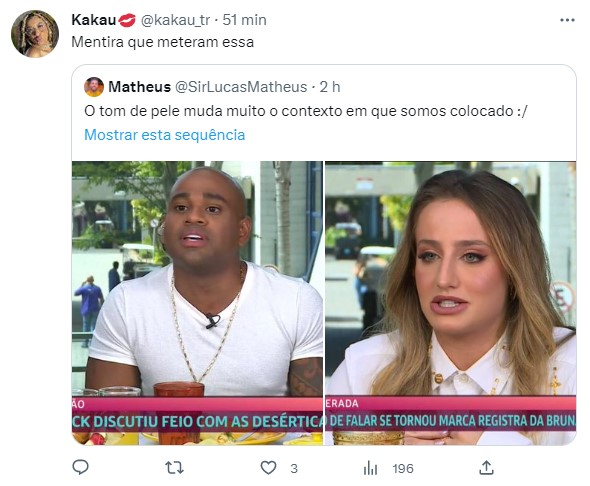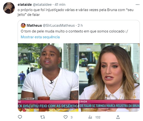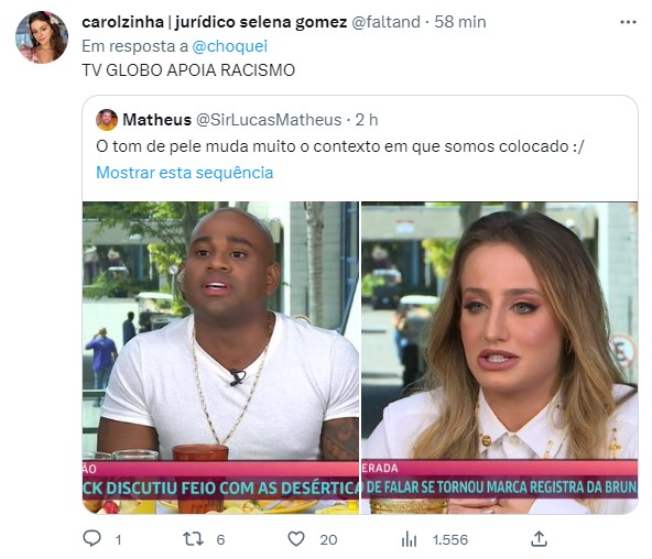 Um perfil disse que a régua moral para os pretos é diferente na comparação com os brancos. Outro exigiu uma retratação por parte de Ana Maria Braga depois do erro grave. Um terceiro acusou a Globo de ser apoiadora de racismo. Mais um viu o momento e ficou extremamente enojado.